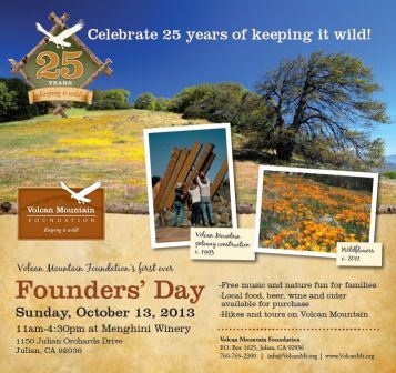 The Volcan Mountain Foundation is especially excited to turn 25 on Sunday, October 13th and VMF will have its first-ever Founders’ Day event to celebrate from 11am-4:30pm at Menghini Winery. The entire community is invited to this free event! You can find more information about the celebration, and the other opportunities for exploration by visiting www.VolcanMt.org.