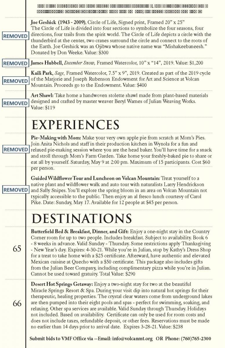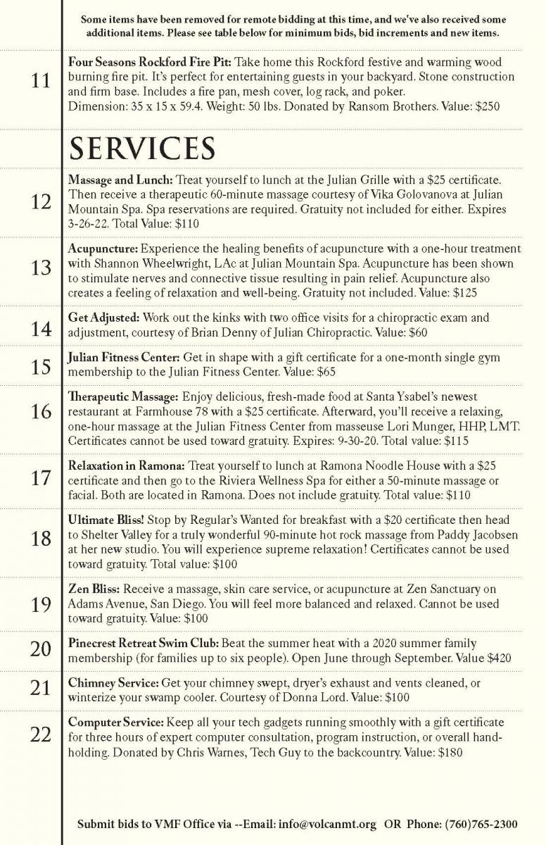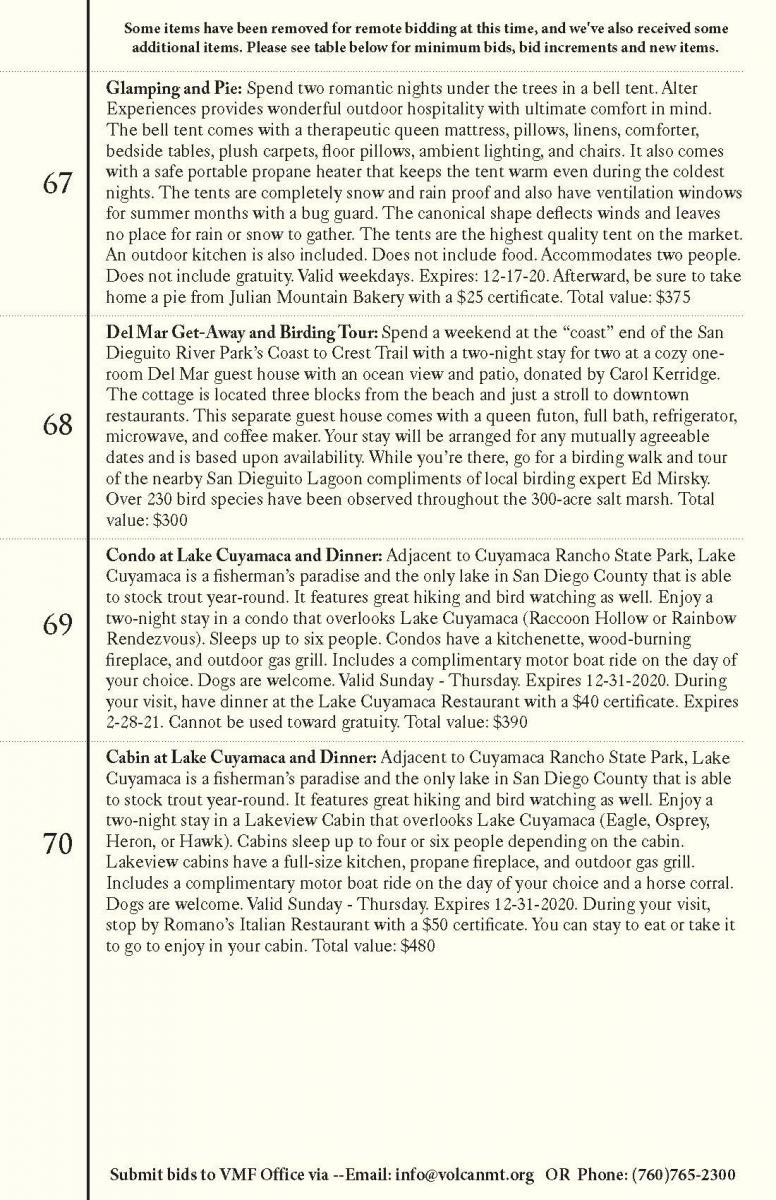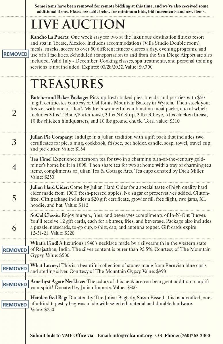 Email or phone in your bids at: info@VolcanMt.org or (760) 765-2300.