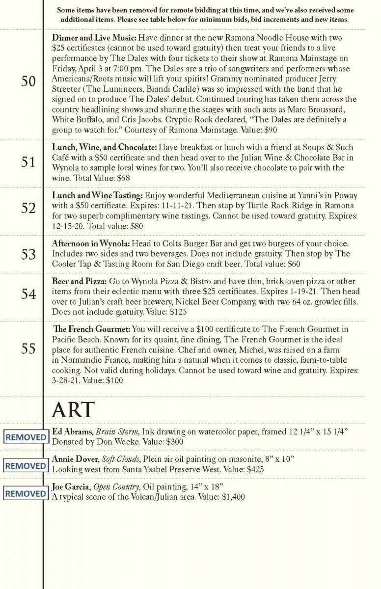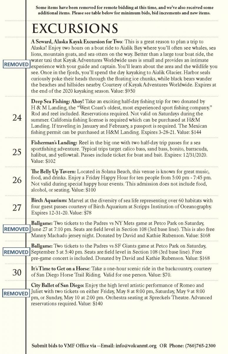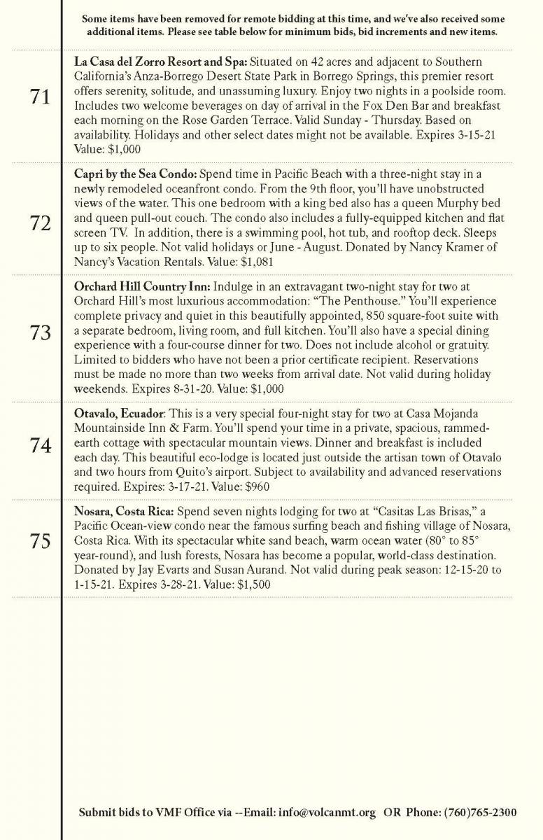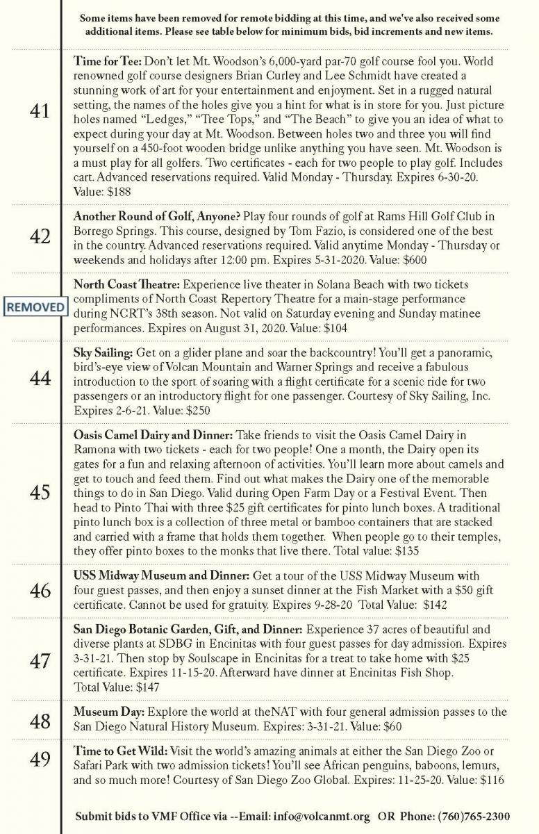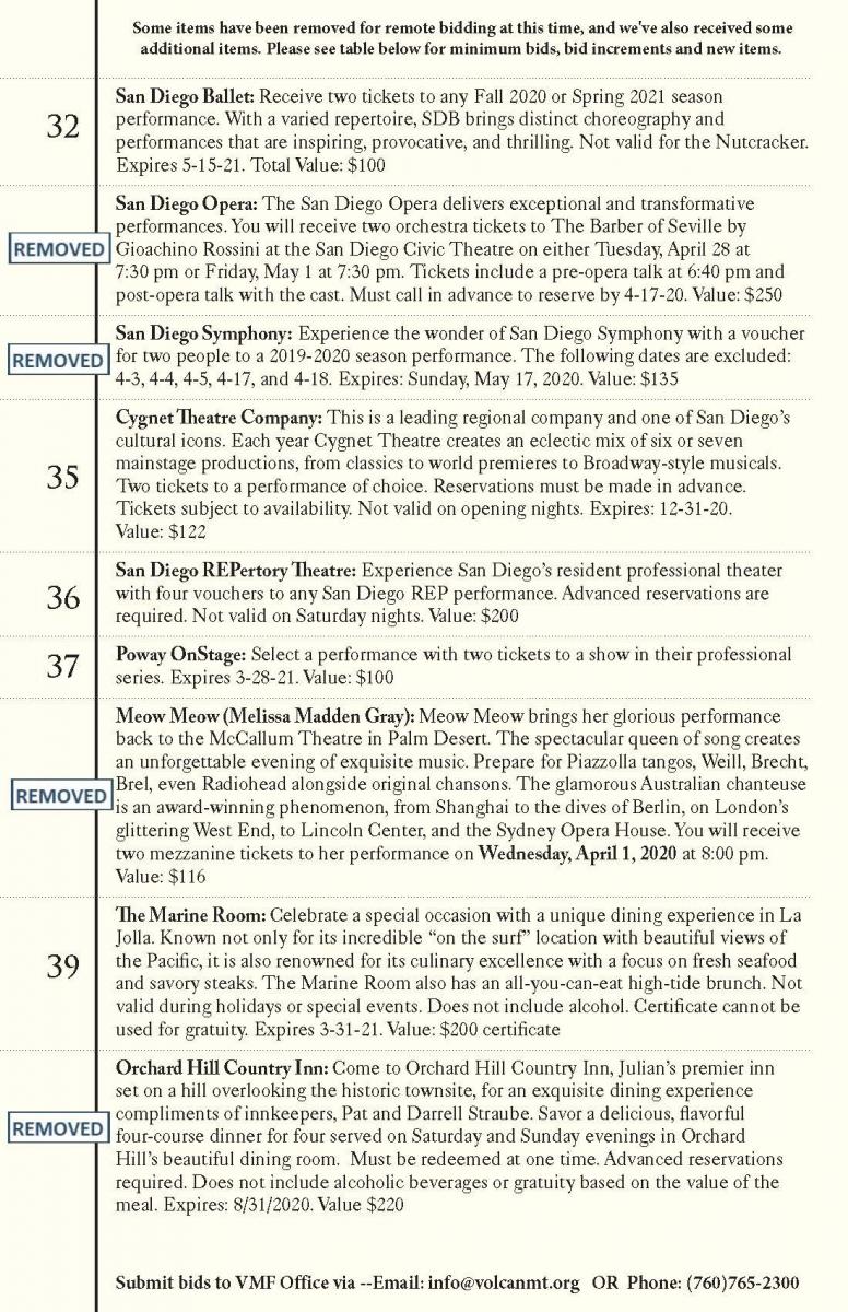 Email or phone in your bids at: info@VolcanMt.org or (760) 765-2300.