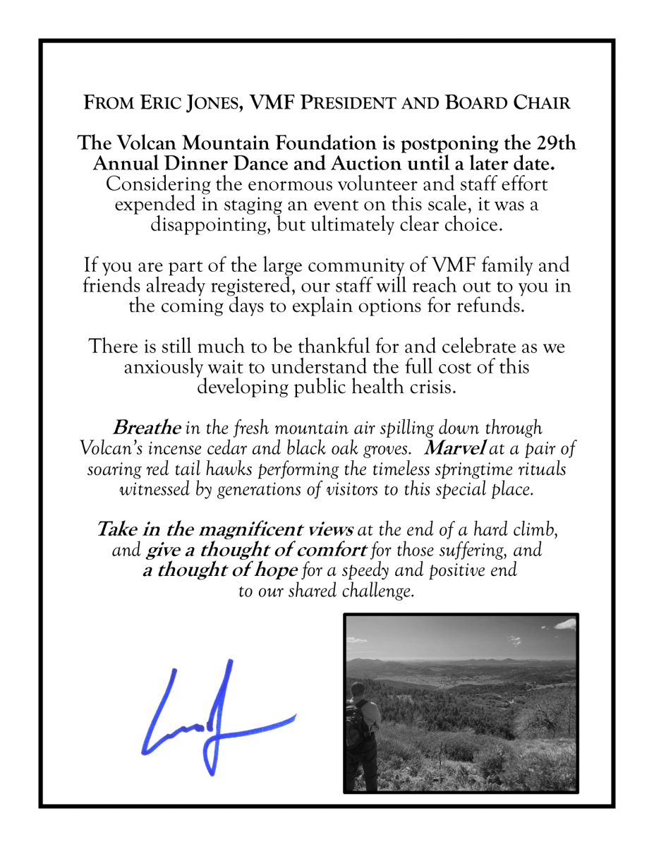 The Volcan Mountain Foundation is postponing the 29th Annual Dinner Dance and Auction until a later date.  Considering the enormous volunteer and staff effort expended in staging an event on this scale, it was a disappointing, but ultimately clear choice.