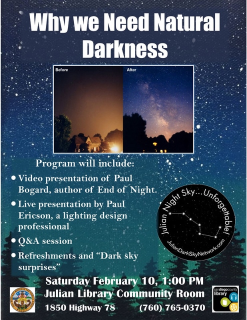 Saturday, February 10th the Julian Dark Sky Network (JSDN) will give a presentation at the Julian Library at 1pm about how we can help make sure that we will always have "starry, starry nights". In order to do that we must learn how to protect our night skies from light pollution.