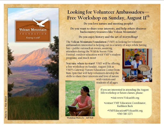 If you are interested in attending the workshop or future classes, please visit www.VolcanMt.org or contact VMF Education Coordinator, Kathleen Beck at VMFEducation@VolcanMt.org or 760-518-3273.