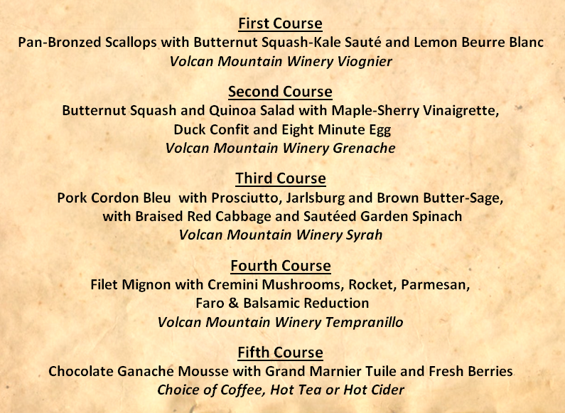 This VMF fundraising dinner is limited to 55 guests, who will enjoy the farm-to-table cuisine of Chef Jeremy Manley. Each of four gourmet courses will be paired with wines from the Volcan Mountain Winery, capped by a decadent chocolate ganache dessert and coffee!